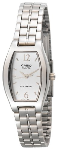 This elegantly designed timepiece from the Casio Edifice series looks equally at home with a little black dress, a business suit, or as a classy touch to casual wear. The gracefully curved, rectangular dial provides a white backdrop to the dainty silver-toned dash and Arabic numeral hour markers and the delicate silver-toned hands. The silver-toned bezel and silver-toned stainless steel braided band complete the look. The band closes with a secure fold-over clasp with a double push-button safety release. This analog quartz movement watch is water resistant up to 99 feet and has a three-year battery life.