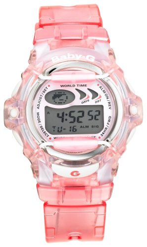 Keep your most important contact information with you while jogging or mountain biking with this Casio Baby-G women's sport digital watch (model BG169-4V). It features a 20-page databank that allows you to store phone numbers and other valuable contact information (8 characters for name and 12 characters for telephone number). Delightfully stylish with a light pink translucent jelly resin case and strap, this shock-resistant watch also offers a 1/100-second stopwatch (up to 24 hours), daily alarm, 12/14-hour formats, world time from 40 cities, and an hourly time signal. You can automatically count down the days from the current date to a target date with the five day counters (each featuring 8 input characters for identification). It will also stand up to the rigors of recreational scuba diving, with water resistance to 200 meters (660 feet). Other features include a scratch-resistant mineral crystal, AfterGlow LED electro-luminescent backlight, and accuracy to +/- 15 seconds per month.