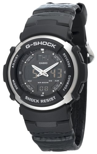 Take it to the streets with the Casio G-Shock Street Rider analog/digital men's watch (model G304RL-1A1V). Large and in charge (with a 46mm width, or 1.8 inches), this shock resistant watch will withstand virtually any punishment you can mete out. It will also stand up to the rigors of recreational scuba diving, with water resistance to 200 meters (660 feet). Stylishly appointed, it has a durable black resin case that's accented by a silver top ring, black dial, and luminous gray hands. It's completed by a resin/synthetic leather combo strap.